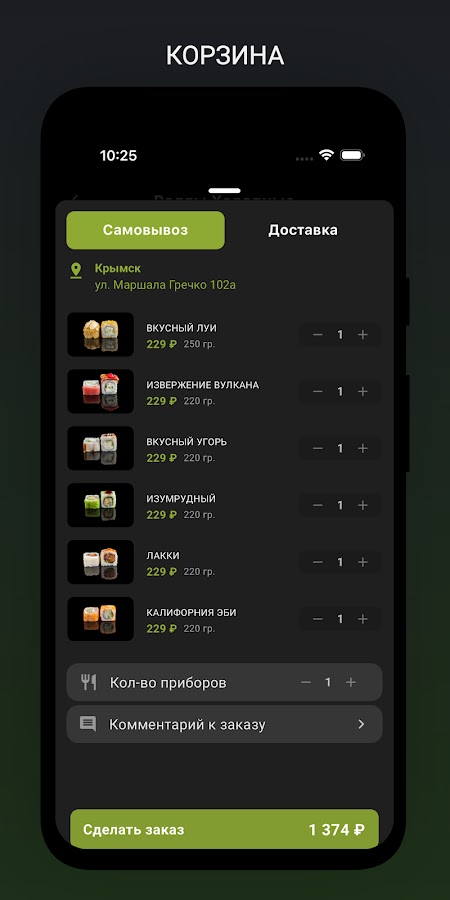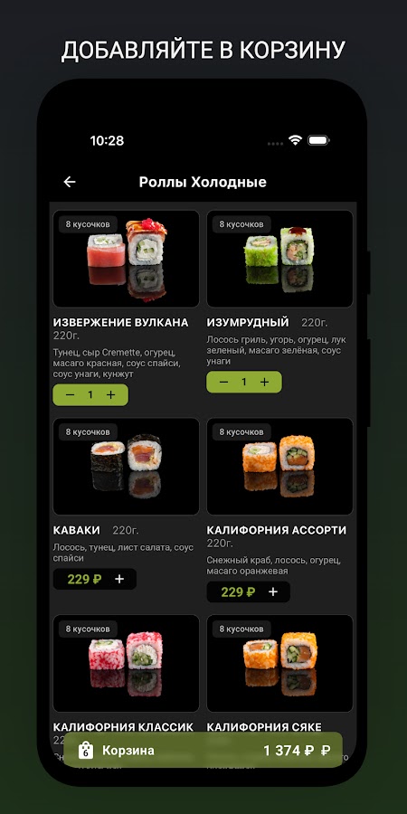 Приложение Wasabist предлагает широкий выбор блюд: холодные и теплые роллы, темпурные роллы, различные наборы, гигантская пицца 50 см, пицца 33 см, а также напитки и соусы.