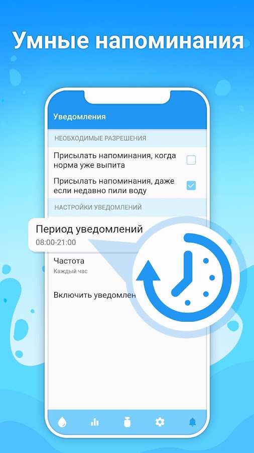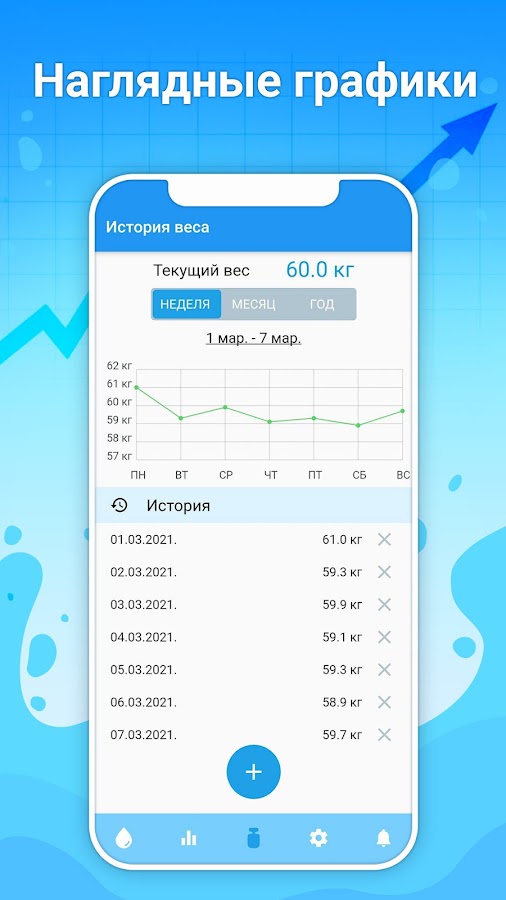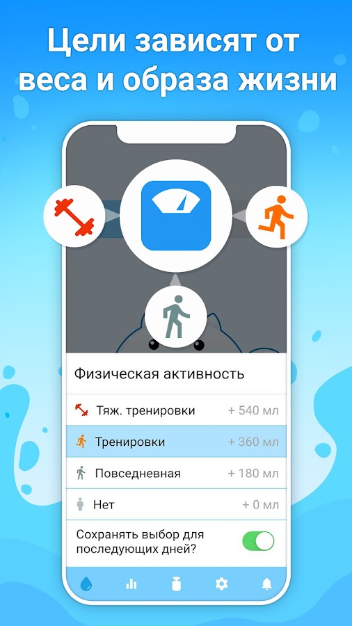 Приложение самостоятельно рассчитает необходимую именно вам норму воды с учетом вашего пола и веса, а также будет корректировать ее в зависимости от погодных условий и физической активности.