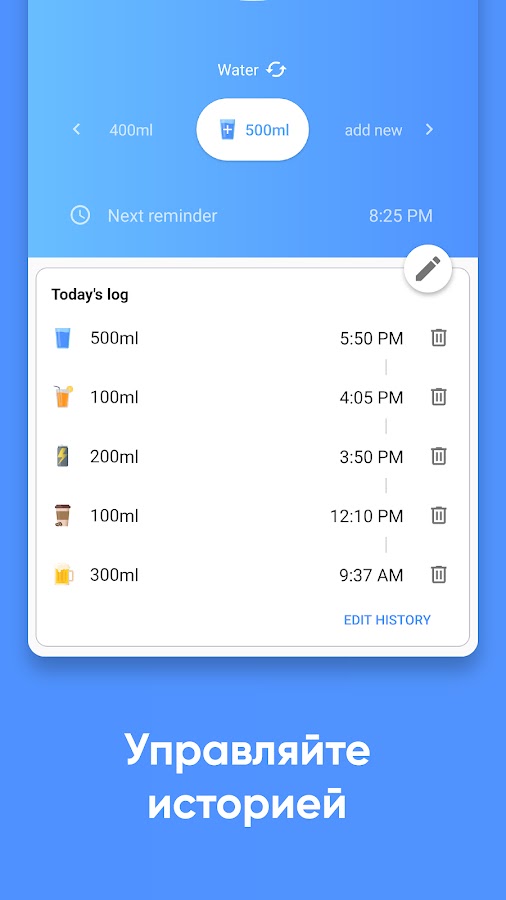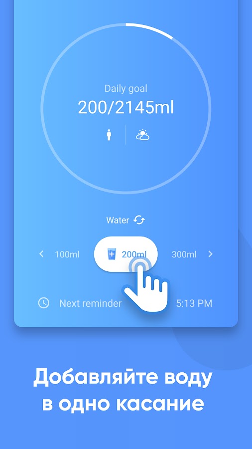 📈 Статистика – Водный баланс – Напоминание пить воду отслеживает употребление H2O, следит за тем, сколько нужно пить воды в день, чтобы вас не мучала жажда. А система правильного приёма поможет похудеть с помощью воды, подскажет, как ускорить метаболизм. Хотите узнать, какая норма воды в день?