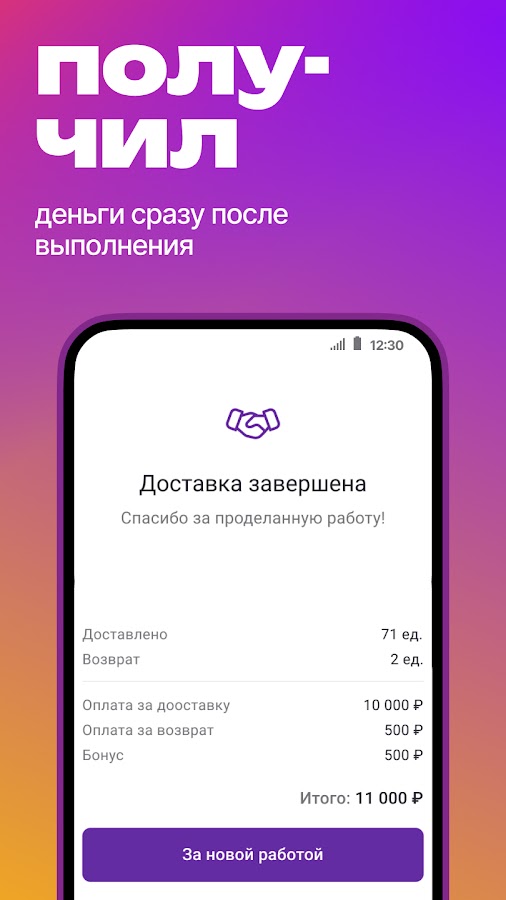 Мы размещаем заказы, а вы откликаетесь на них, выбираете маршрут и время доставки груза на ПВЗ или склад.