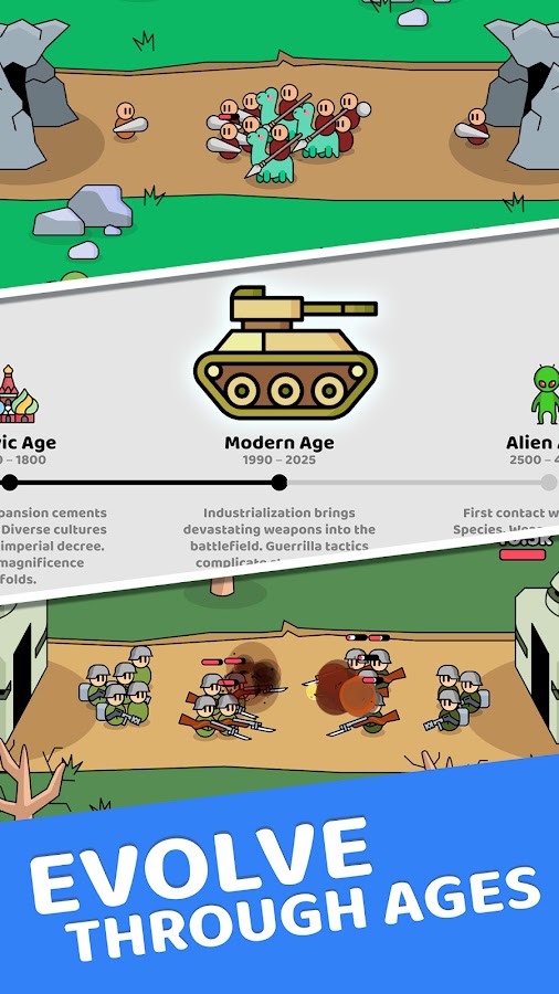 Захватывающий геймплей: Испытайте волнение от эволюции своей армии и освоения новых юнитов по мере продвижения через разные исторические периоды.