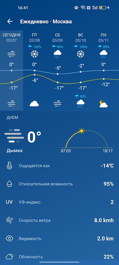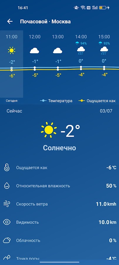 — Различная актуальная информация о погоде: температура, ветер, влажность, точка росы, осадки, видимость, восход, закат.