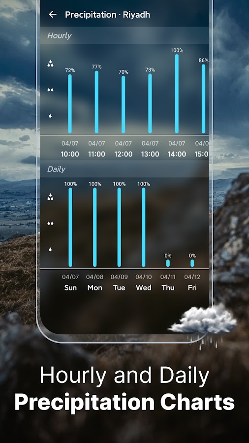 — Отображение графиков для ежечасного и ежедневного прогноза погоды, вероятности дождя, состояния ветра и качества воздуха