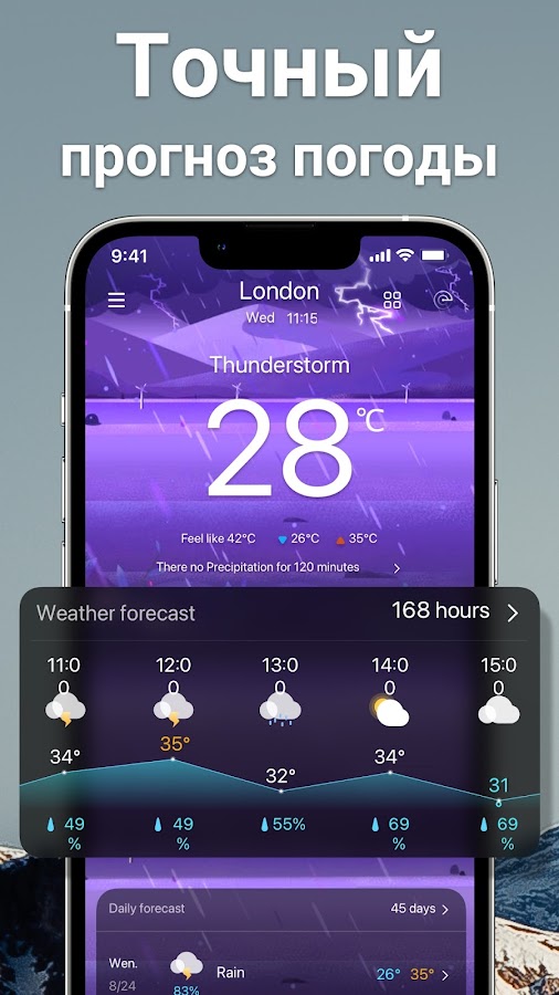 Прогноз погоды — приложение Live Weather & Weather Radar предоставляет вам точную информацию о погоде, где бы вы ни находились. Погода будет обновляться ежечасно. Приложение прогноз погоды может предоставить вам подробный локальный прогноз и глобальный прогноз, где вы находитесь!