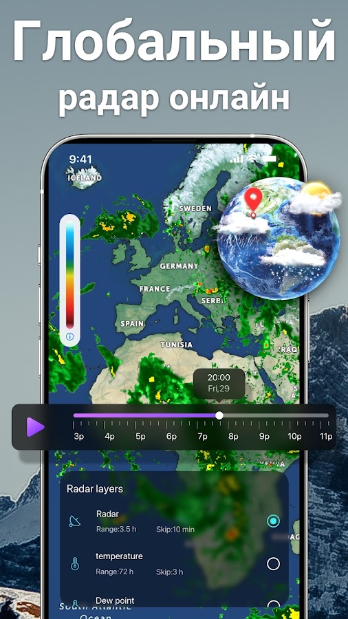 Прогноз погоды — Weather Radar — это быстрое и простое в использовании приложение, которое отображает анимированные метеорологические данные о вашем текущем местоположении.