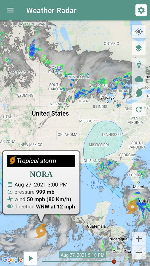 Смотрите ураганы, тропические штормы, облачность и количество дождя на карте в режиме реального времени.