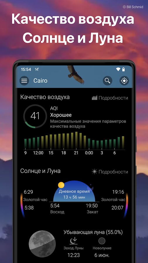 — Солнце и луна: время восхода солнца, время захода солнца, сумерки, фазы луны, полнолуние, новолуние, возраст луны.