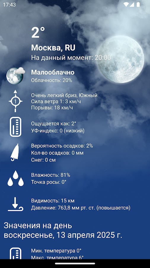 • Информация доступна каждый час: Температура, Вероятность дождя, Скорость ветра, Облачность, Влажность, Давление, УФ-индекс