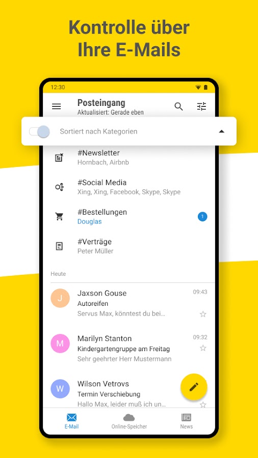 Ваша почта наглядно организована по категориям, фильтрует нежелательные рассылки и отображает информацию об онлайн-заказах и отслеживании посылок (например, от Deutsche Post и DHL).