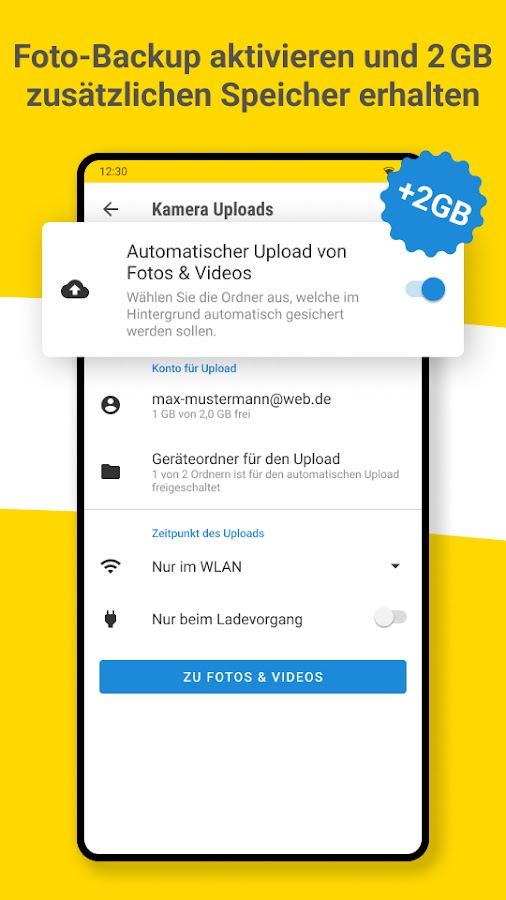Легко сохраняйте и делитесь файлами и фотографиями в интегрированном облаке с проверенными стандартами безопасности WEB.DE.