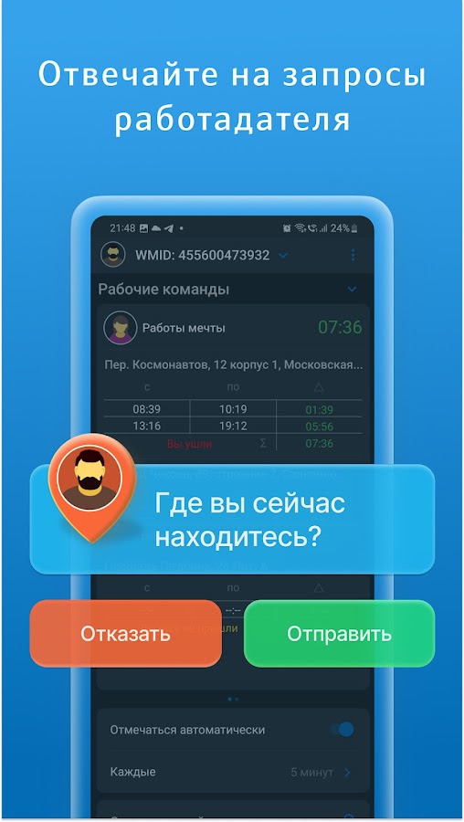 Сотрудник рабочей команды может установить приложение, которое будет периодически проверять нахождение пользователя в районе контроля (офис и прочее объекты).