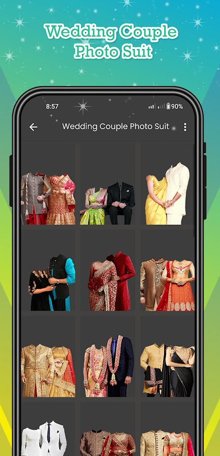 Костюм для свадебной пары — Редактор фотографий для пар позволяет вам сделать фотографию пары из галереи, дает вам возможность масштабировать или изменять размер и адаптировать вашу фотографию к подходящему шаблону платья с помощью простых сенсорных жестов, мгновенно сохранять ее в медиафайлах и вносить значительный вклад в фотосессия событий жизни.