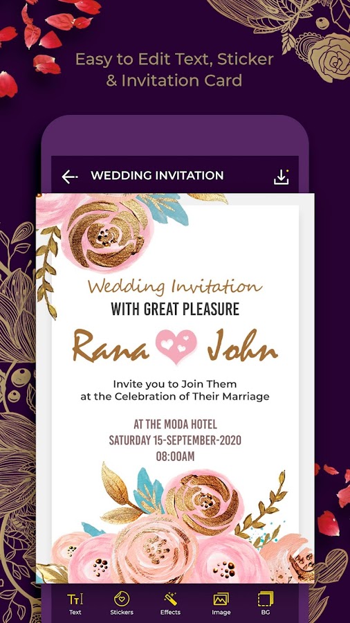 Wedding Card Maker — это самый простой способ создать свадебную открытку с привлекательным дизайном. С помощью этого приложения вы можете мгновенно создать пригласительный билет на свадьбу. Добавьте информацию о свадьбе, такую как имя, дата, место, местоположение, а затем все, что вам нужно сделать, это выбрать дизайн карты по вашему выбору, а затем вы попадете в наши параметры инструмента редактирования, такие как текст, рамки, наклейки и лучшие привлекательные цитаты. и т.п.