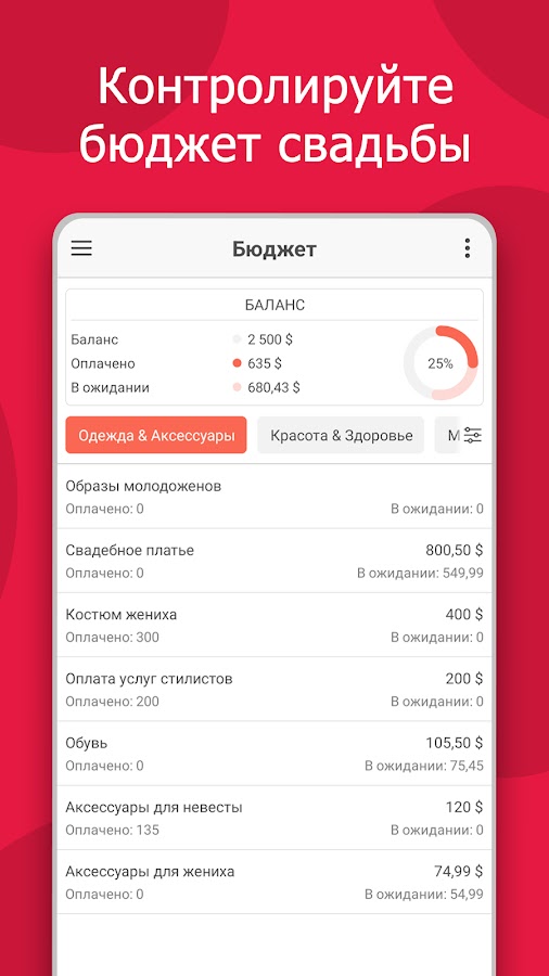 Приложение MyWed поможет вам составить список свадебных подрядчиков. Сохраняйте информацию о специалистах, связывайте их с бюджетом, контролируйте платежи за их услуги и звоните им прямо с приложения.