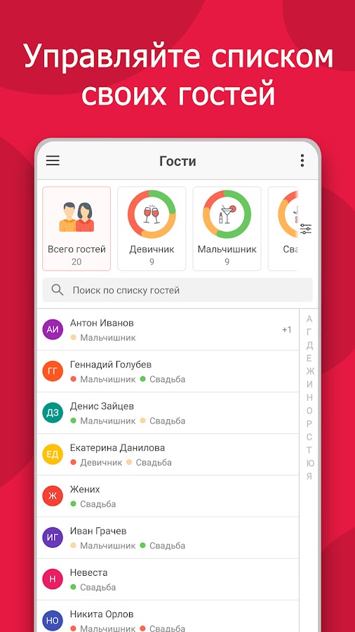 Приложение поможет управлять списком гостей. Добавляйте гостей и их компаньонов, составляйте план рассадки, указывайте их предпочтения по меню и распределяйте по мероприятиям (девичник, мальчишник, свадьба и т.д.).