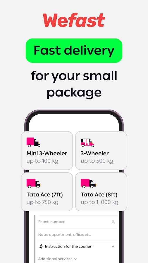 Wefast — это профессиональная платформа для доставки посылок, разработанная для того, чтобы помочь частным лицам, малым предприятиям и крупным компаниям быстро, надежно и недорого управлять внутригородскими отправлениями. Нужен ли вам мотоцикл, трехколесный транспорт или мини-грузовик, Wefast предоставит подходящее транспортное средство и профессиональных грузчиков для обработки каждого заказа.