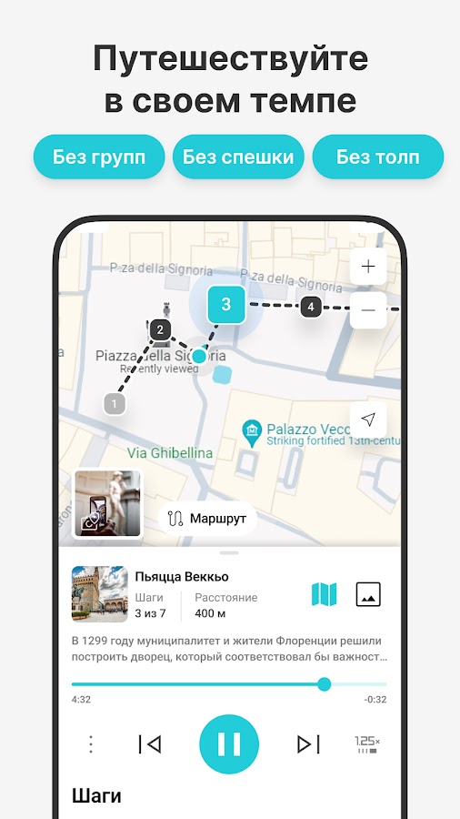 Профессиональные гиды создают для вас экскурсии с аудио, GPS оффлайн навигацией, загадками и дополненной реальностью. В некоторые аудиотуры уже включены билеты в музеи. Узнавайте уникальные истории о тайных местах и главных достопримечательностях города в собственном темпе самостоятельно без интернета.