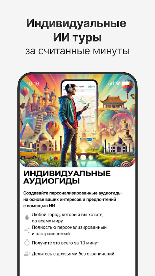 Превратите свой телефон в персонального гида и откройте для себя атмосферные места города, известные достопримечательности и лучшие музеи мира по- новому. Вам больше не нужно думать над тем, куда сходить, путешествуя по России и миру. Мы знаем лучшие туристические маршруты и особые места в москве и других городах — ваше путешествие заиграет новыми красками!