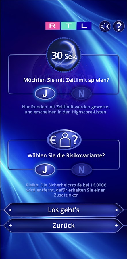Конечно, вы можете использовать джокер 50:50, джокер аудитории и телефонный джокер, чтобы помочь вам в каждой игре. Хотите сыграть с дополнительными джокерами? Затем выберите вариант риска. Но будьте осторожны: вы отказываетесь от уровня безопасности в 16 000 баллов и должны согласиться на 500 баллов, если ответите неправильно.