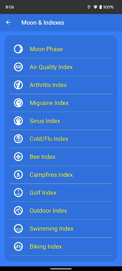 — Индексы качества воздуха, артрита, мигрени, синуса, простуды/гриппа, пчелы, костра, гольфа, улицы, плавания и езды на велосипеде.
