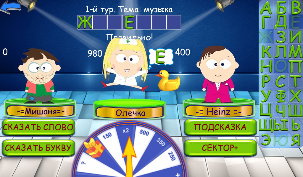 — Сектор+ — откроет первую закрытую букву. Сектора и подсказки накапливаются и вызываются в любой удобный для Вас момент, когда Ваша очередь сказать букву.