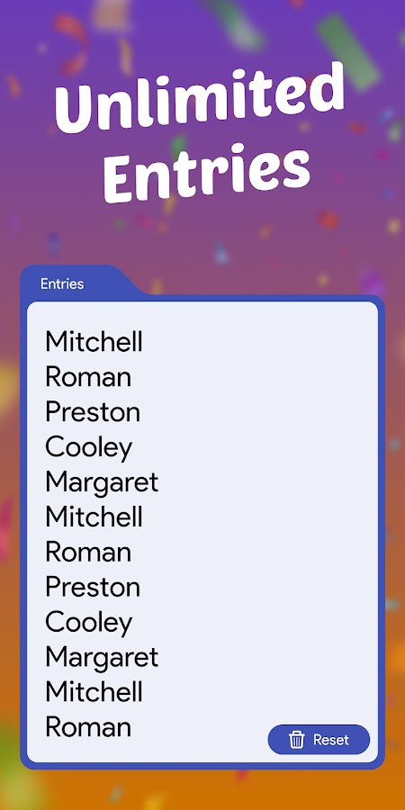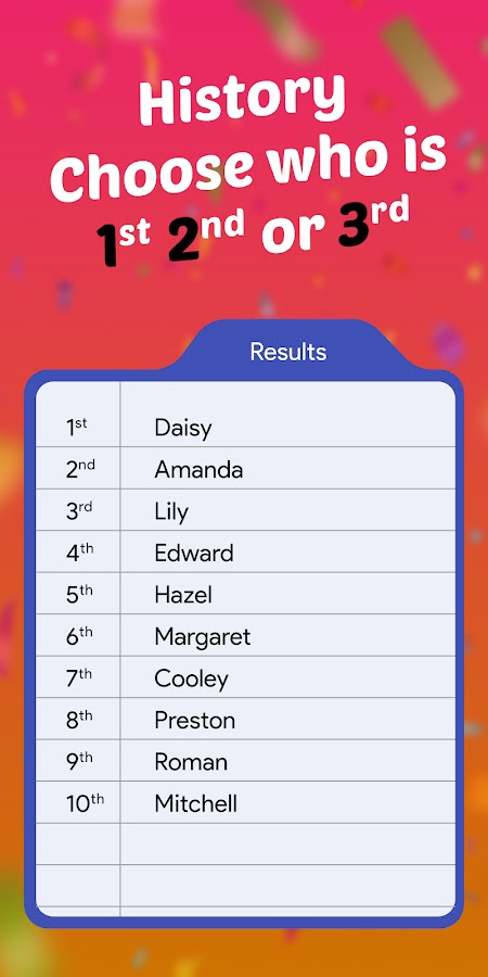 Пытаетесь решить, кто будет первым в игре, выбрать победителя конкурса или распределить задания? Колесо имен делает процесс принятия решений увлекательным и легким! Будь то классные комнаты, вечеринки, командные встречи или подарки, это приложение поможет вам выбрать случайное имя. Просто введите свой список имен, покрутите колесо, и пусть оно творит чудеса. Это увлекательно, честно и очень просто в использовании!