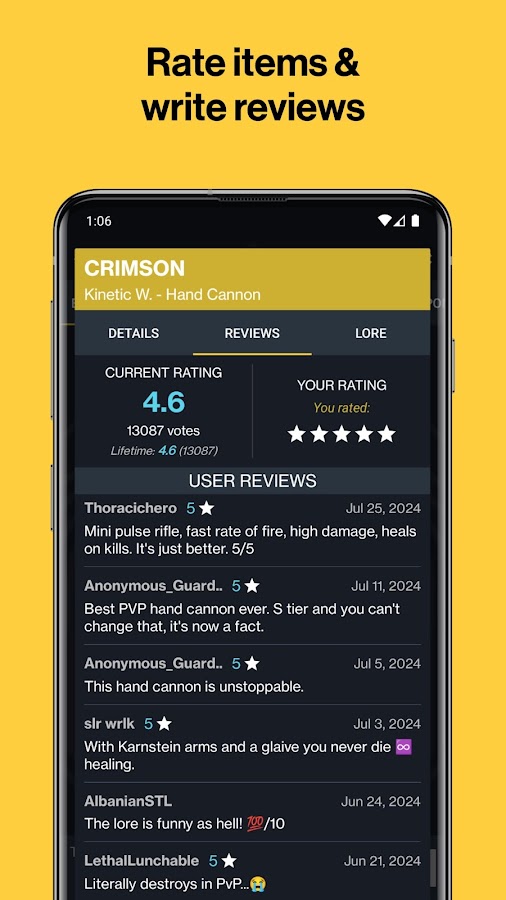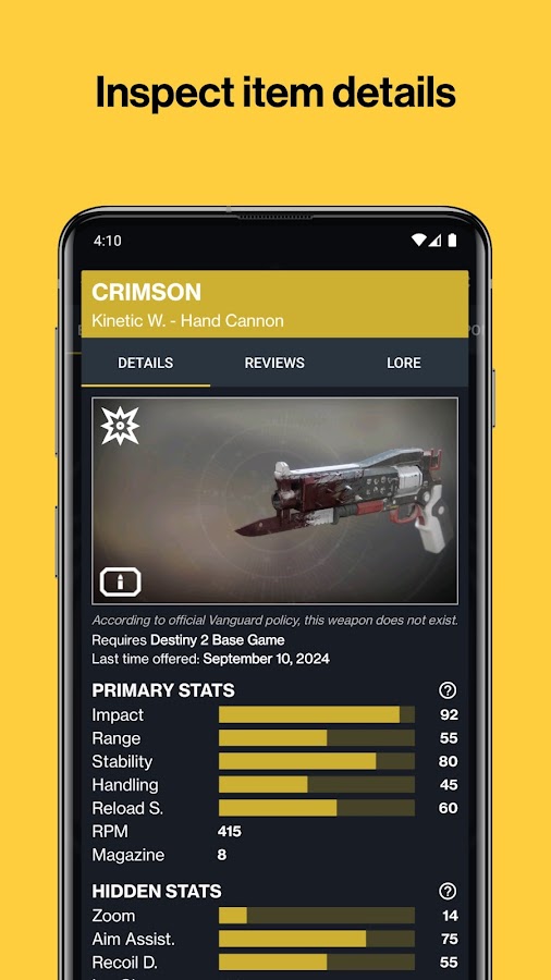 Подробная информация об экзотическом снаряжении: Изучайте подробную статистику и бонусы оружия и брони.