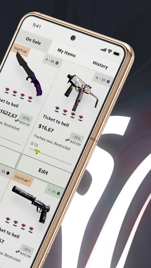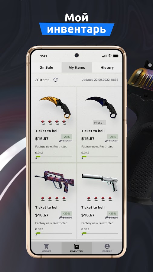 В свежем обновлении мы представили новый дизайн приложения, добавили разные виды карточек, а также сделали доступной возможность ПОКУПАТЬ, ПРОДАВАТЬ и просматривать CS2 скины. Инвентарь теперь поделен на «Доступный» и «В продаже». Кроме того, мы создали экран сделок с их состояниями. Чем не market мечты?