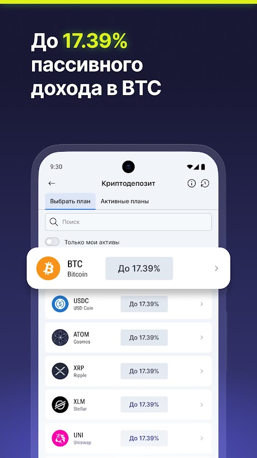 — Криптодепозит. Получайте до 18,64% пассивного дохода в зависимости от актива и продолжительности выбранного плана хранения.