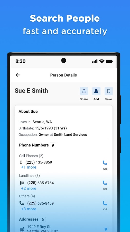 Получите точные контактные данные и справочную информацию с помощью Whitepages Find People, надежной телефонной книги и приложения обратного поиска! Используйте поиск людей, чтобы найти потерянные контакты, поиск по номеру телефона, чтобы идентифицировать неизвестных звонящих, или бесплатный поиск адреса, чтобы найти владельцев недвижимости. С помощью Whitepages Find People вы можете выполнять поиск людей, чтобы получить номера телефонов, адреса, электронные письма, биографические отчеты и многое другое. Вы также можете легко синхронизировать и очистить свои контакты, чтобы они всегда были актуальными. Получите быстрый доступ к информации с помощью Whitepages Find People – вашего каталога для поиска настоящих людей!