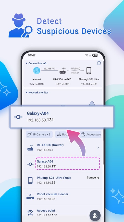 — Идентифицировать типы устройств: получать подробную информацию о каждом устройстве, включая его тип (смартфон, ноутбук и т. д.), IP-адрес и поставщика.