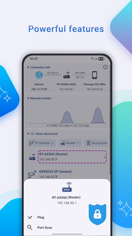 — Мониторинг состояния сети: отслеживайте использование сети в реальном времени, скорость пинга и доступность портов для обеспечения оптимальной производительности.