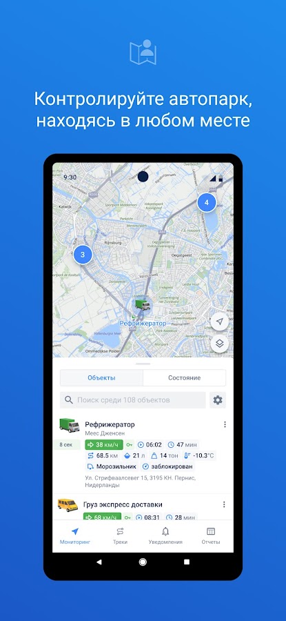 — Управление списком объектов. Отслеживайте движение и состояние зажигания, местоположение объектов и другие данные автопарка в режиме реального времени.