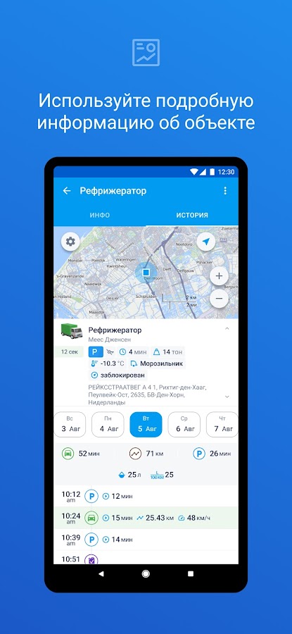 — История. Отслеживайте события объекта (движение, остановка, заправка, слив топлива) в хронологическом порядке и отображайте их на карте.
