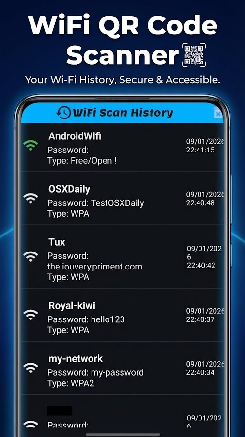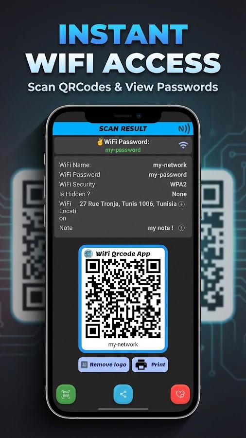 By Scanning WiFi certified QrCode, get all details (Password, login …), save and manage them !