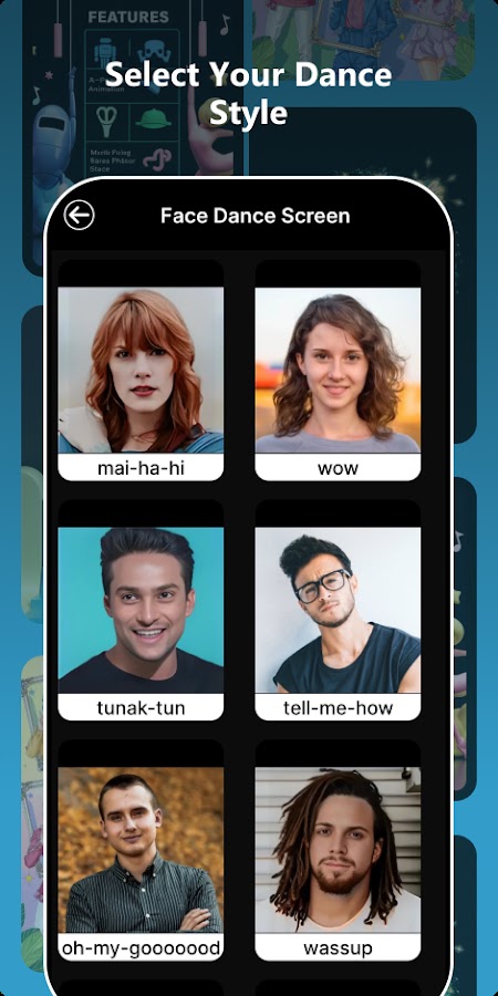 ✔️ Эффекты танца лица с искусственным интеллектом: сделайте свою фотографию под популярные мелодии, такие как «Май-ха-привет!», «Тунак Тун!», «Wassup!», «We Will Rock You!», «С Днем Рождения» и другие.