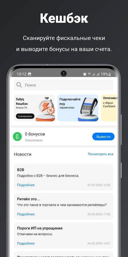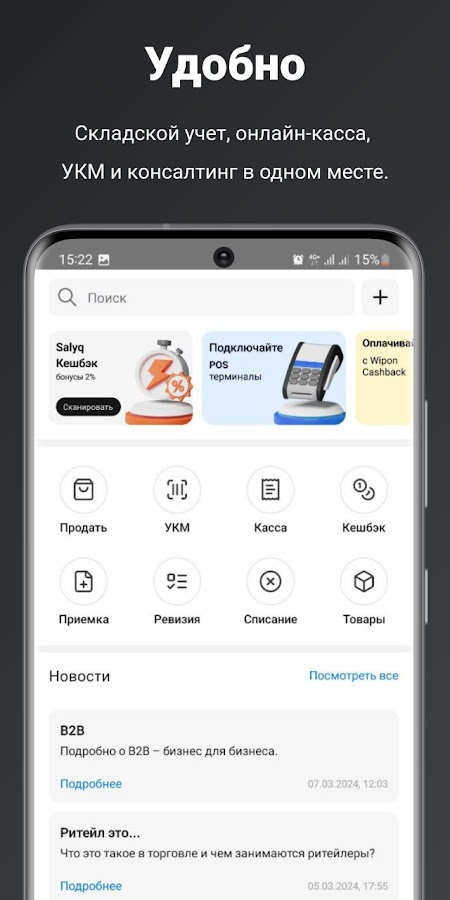 Wipon — это приложение для автоматизации, в котором есть складской учет, онлайн-касса, проверка УКМ, кешбэк и консалтинг. Более 50 тысяч клиентов ежедневно управляют бизнес процессами и торговлей. Приложение подходит как для юридических, так и для физических лиц, предоставляя широкий спектр функционала для удобства и эффективности.