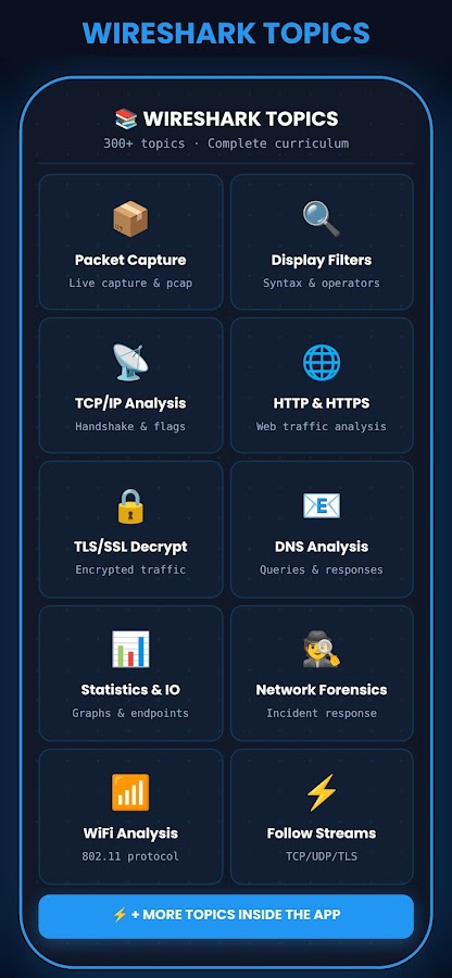 Учебник по Wireshark – это самое полное бесплатное приложение для освоения Wireshark и анализа сети с нуля. Независимо от того, являетесь ли вы новичком или опытным профессионалом, стремящимся к сертификации CEH, OSCP и в области кибербезопасности, это приложение охватывает команды Wireshark, перехват пакетов, анализ протоколов и тенденции кибербезопасности 2026 года на вашем родном языке, в любое время и в любом месте.