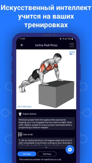 — Интеграция оборудования: Работайте с гантелями, штангами, гирями и другими, или выберите упражнения без оборудования.