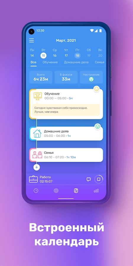 Вы сможете вести хронометраж дня, и наглядно увидеть какой на сам деле у вас режим дня, на что вы тратите свое время: