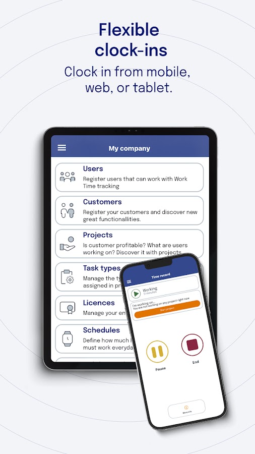 У ваших сотрудников нет телефона? Установите приложение на планшет / телефон и поместите его в рабочий центр. Назначьте каждому сотруднику PIN-код, и они могут зарегистрироваться с помощью этого планшета / телефона без установки приложения на своих телефонах.