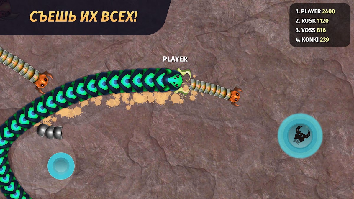 — Атакуйте других — поглощайте червяков, чтобы увеличить длину и здоровье.