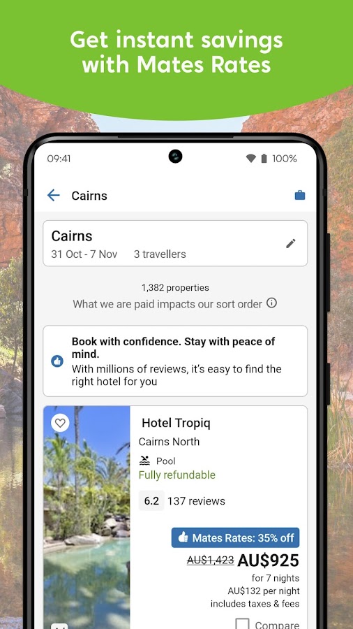 Выбирайте из множества вариантов размещения в тысячах мест по всей Австралии и за её пределами (включая отели, курорты, парки отдыха, арендуемое жильё, коттеджи и многое другое). Просматривайте результаты поиска отелей на интерактивной карте. Читайте реальные отзывы от проверенных гостей отелей. Сравнивайте цены, рейтинги и удобства прямо в приложении.