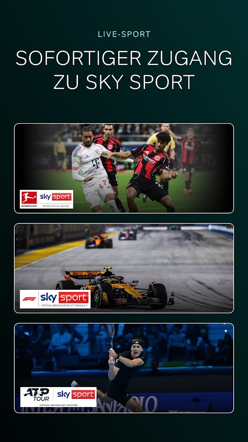 Лучшие спортивные трансляции от Sky Sports, включая все матчи Бундеслиги и 2-й Бундеслиги в прямом эфире по пятницам и субботам, а также все матчи Премьер-лиги и Кубка Германии. Плюс все гонки Формулы-1 и MotoGP в прямом эфире, хоккей, баскетбол, теннис, гольф и многое другое.