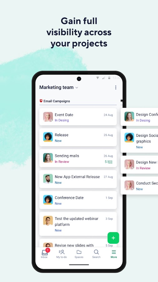 • Просматривайте и корректируйте проекты в виде списка, канбан-доски, диаграммы Ганта^ или графика загрузки^