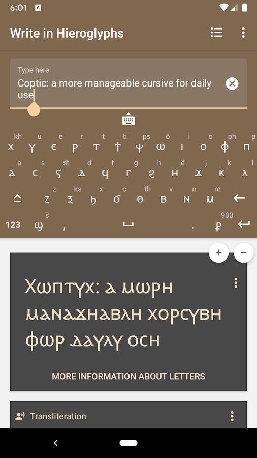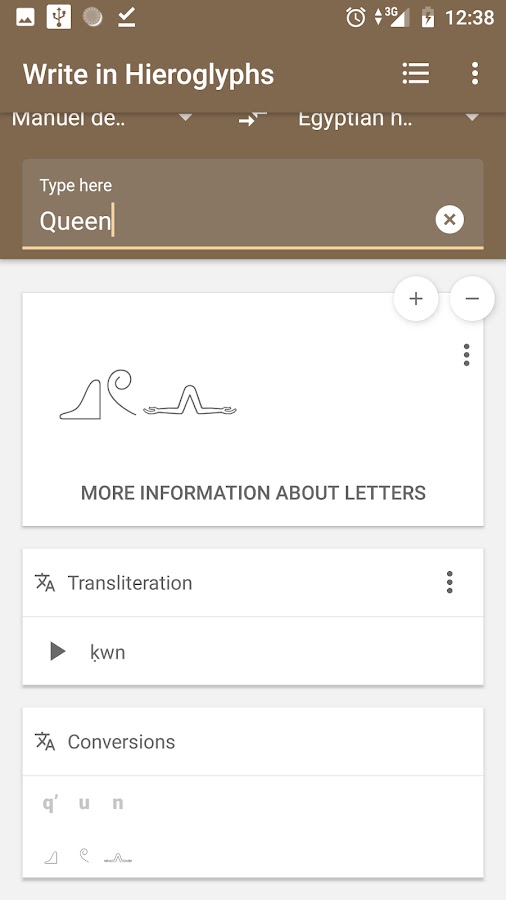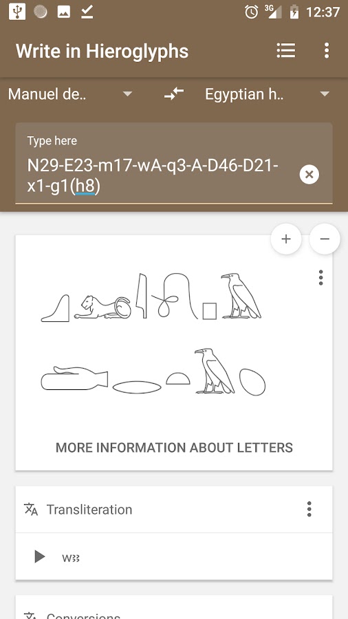 Это приложение переводится с современных писем на египетские иероглифы. Обратите внимание, что это приложение переводит звуки слов, не обязательно значения!