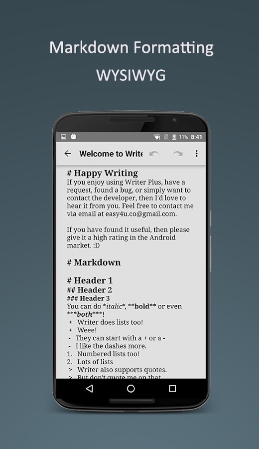 ПРИМЕЧАНИЕ. Старая версия (<=v1.48) Writer Plus хранит файлы в папке /Writer/ внешней карты (на большинстве устройств это означает SD-карту, на других — раздел основной флэш-памяти). В связи с обновлением до новой версии Android SDK файлы на SD-карте больше не будут доступны напрямую. Чтобы обеспечить безопасность ваших данных, нам необходимо перенести эти файлы в собственную папку приложения. Демо-версия миграции: https://drive.google.com/file/d/1tz5-LwUtp9LhIlwl_VrwXzv90OGJVBjw/view. !!! Некоторые приложения для очистки нежелательной почты могут удалять файлы в каталоге /Writer, пожалуйста, используйте это осторожно!!! Markdown — это легкий язык разметки с синтаксисом форматирования простого текста. Writer Plus поддерживает: - Н1, Н2, Н3 - Курсив и жирный шрифт - Список и нумерованный список - Цитировать Что касается формата Markdown, пожалуйста, обратитесь к https://en.wikipedia.org/wiki/Markdown. Дайте нам знать, если у вас есть предложения - Сообщество Google Plus: https://plus.google.com/communities/112303838329340209656. - Facebook: https://www.facebook.com/writerplus - Электронная почта: support@writer.plus