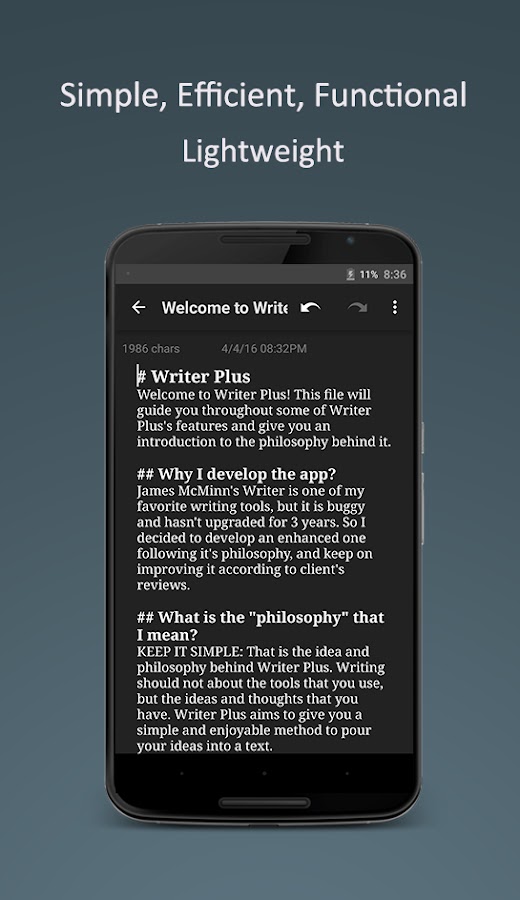 Writer Plus — это приложение для письма, не требующее суеты и отвлекающих факторов, свойственное традиционному текстовому процессору. Writer Plus идеально подходит для написания заметок, романов, текстов песен, стихов, эссе, черновиков на телефоне или планшете.
