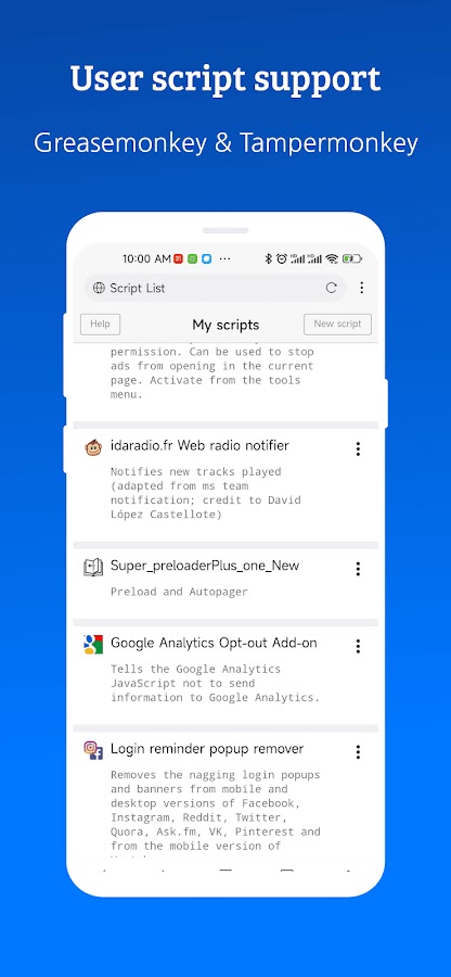 Встроенная поддержка пользовательского скрипта GreaseMonkey и Tampermonkey. Значительно улучшены возможности браузера.