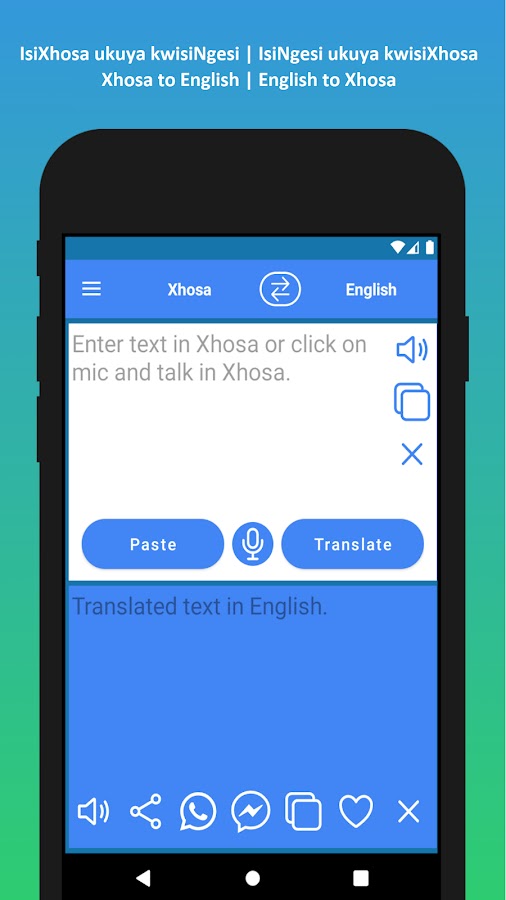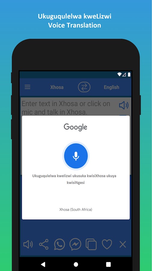 А) Нажмите кнопку «Микрофон» и произнесите текст. Когда вы закончите голосовой ввод, нажмите «Перевести», и приложение Xhosa to English Translator переведет текст.
